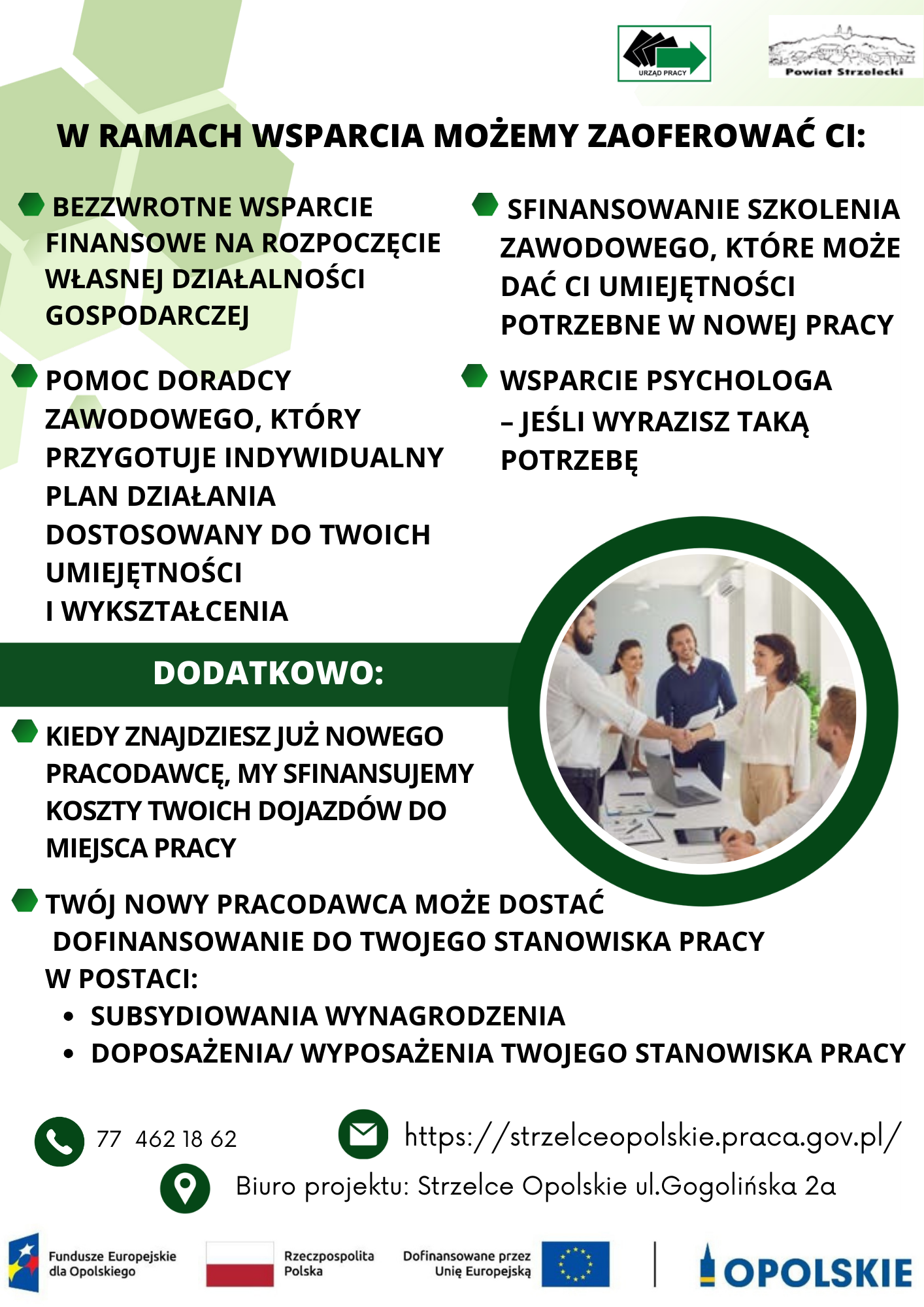 W dniu 17.10.2024 Województwo Opolskie - Wojewódzki Urząd Pracy w Opolu - Partner wiodący złożył wraz z Powiatem strzeleckim - Powiatowym Urzędem Pracy w Strzelcach Opolskich - partnerem projektu wniosek o dofinansowanie projektu „Reorientacja zawodowa dla zwalnianych pracowników" w ramach Działania 05.05 - Adaptacyjność pracodawców i pracowników oraz elastyczne formy zatrudnienia, Typ przedsięwzięcia: wsparcie typu outplacement dla pracowników zagrożonych zwolnieniem, przewidzianych do zwolnienia lub zwolnionych z przyczyn dotyczących zakładu pracy oraz osób odchodzących z rolnictwa, w ramach Osi priorytetowej 5 Fundusze Europejskie wspierające opolski rynek pracy i edukację FEO 2021-2027, współfinansowanego ze środków Europejskiego Funduszu Społecznego Plus